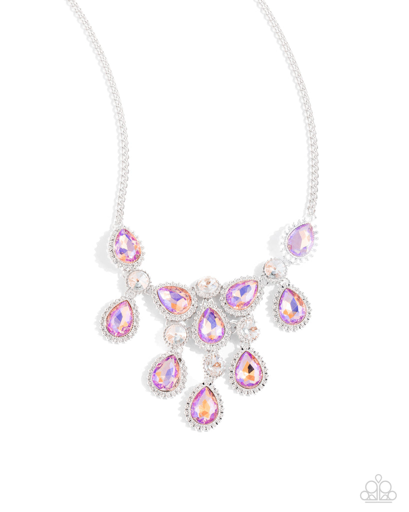 An explosion of round, teardrop, and marquise-cut gems in varying sizes bordered by tactile silver studs cluster together to create a glittery orange showcase down the neckline. Featuring various shades of orange and white, each gem reflects light off of its faceted surface emitting further glitz and glam. Features an adjustable clasp closure.