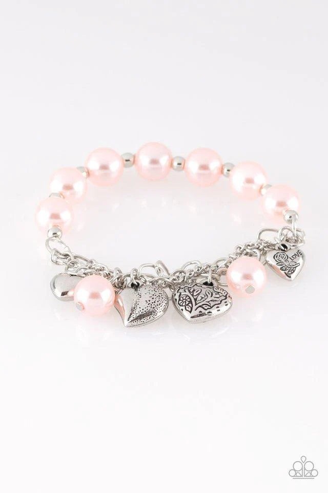 Attached to a section of shimmery silver chain, pearly pink and dainty silver beads are threaded along a stretchy band. Mismatched silver heart charms swing from the glistening chain, creating a flirty fringe. Sold as one individual bracelet.