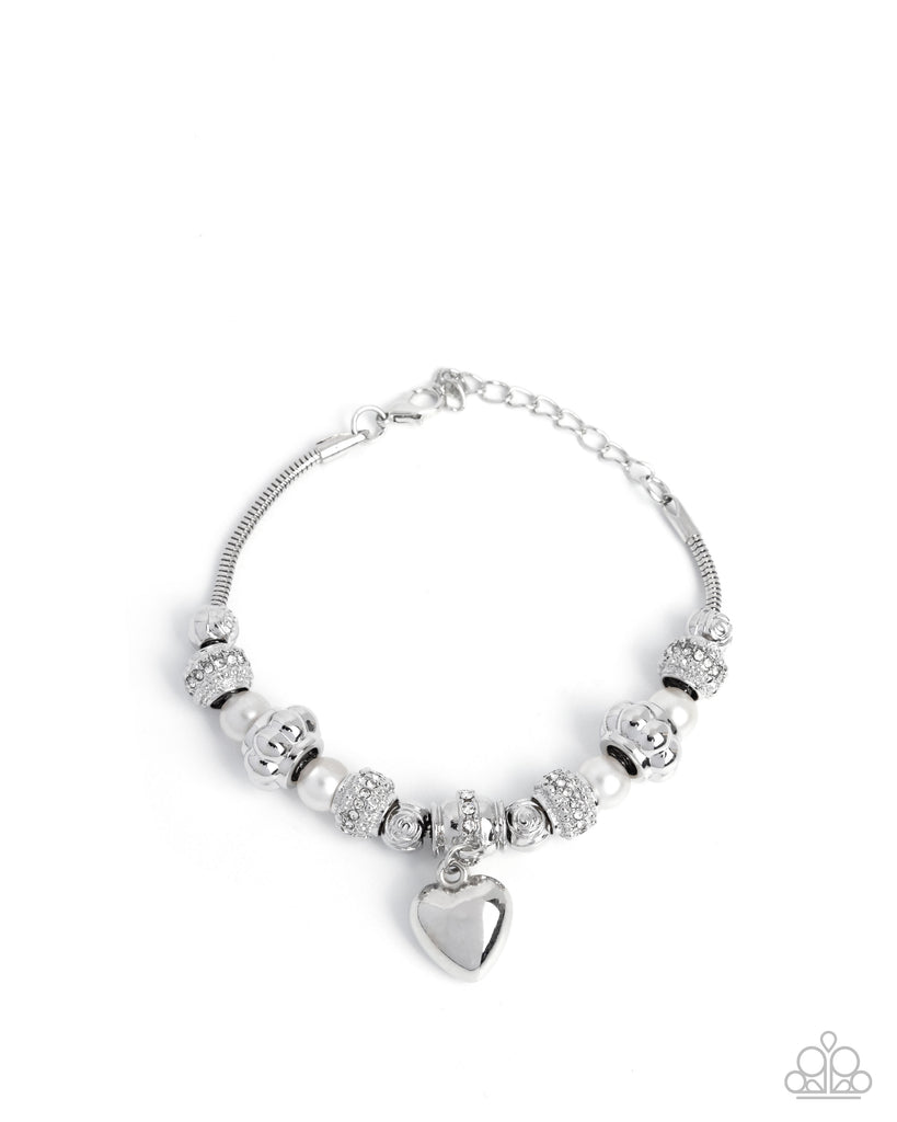 A sleek silver snake chain is adorned with a collection of polished silver and sparkling white rhinestone-embellished beads. Interspersed with pearly accents and intricate filigree details, the design culminates in a shiny silver heart charm that dangles delicately at the center. Features an adjustable clasp closure.