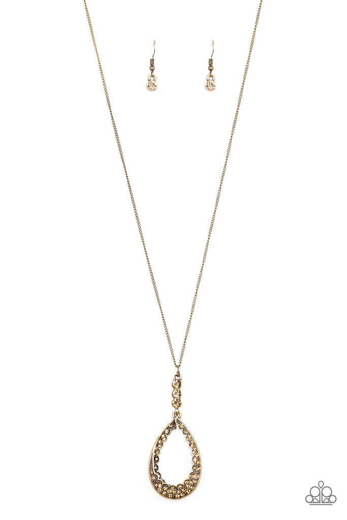 Infused with a lengthened brass chain, three golden topaz rhinestones give way to a glittery teardrop pendant. Dotted with dainty brass studs, the inside and outside of a brass teardrop is encrusted in golden topaz rhinestones for a regal look. Features an adjustable clasp closure.