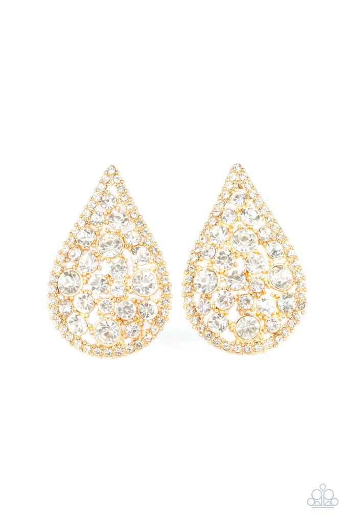 Radiating with glassy white rhinestones, oversized gold teardrops adorn the ear for a dramatic flair. Earring attaches to a standard post fitting.