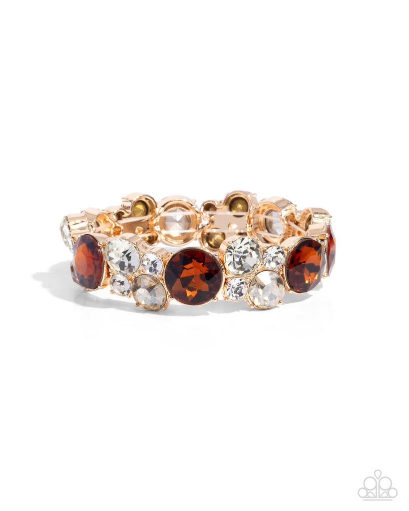 Infused along elastic stretchy bands, highly faceted tea gems pressed in pronged gold fittings alternate with a quartet of white and light-colored topaz gems also pressed in a cluster of gold-pronged fittings for a mismatched, momentous amount of shimmer.