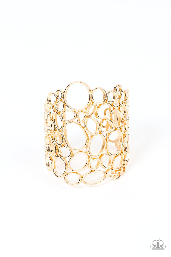 Varying in shape and size, asymmetrical gold circular frames delicately connect into an effervescently abstract cuff around the wrist.