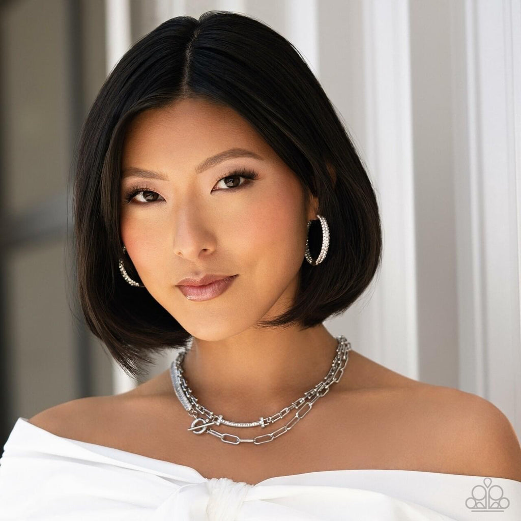 An elongated strand of silver paperclip chain connects to a strand of glistening emerald-cut white gems nestled in silver-pronged fittings that are stacked atop one another through a silver toggle clasp for a monochromatic, mismatched medley. Features a toggle clasp closure.