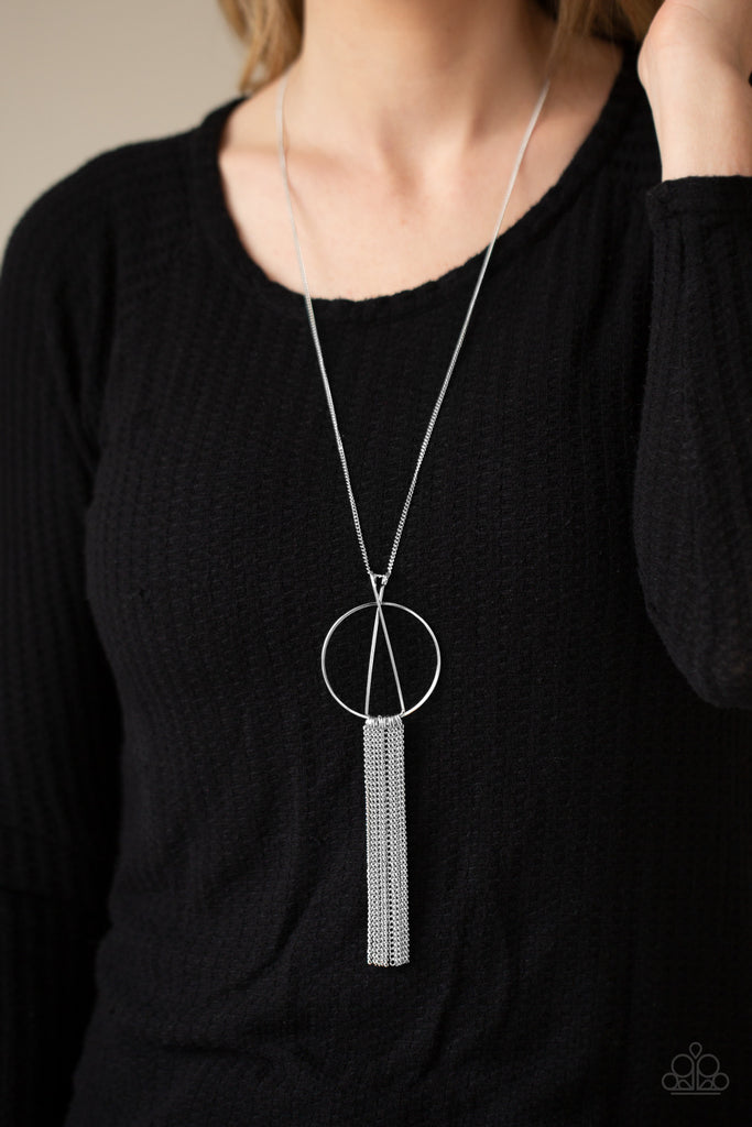 Two silver rods delicately overlap at the top of a glistening silver hoop, creating an abstract pendant at the bottom of a lengthened silver chain. Shimmery silver chains stream from the bottom of the frame, creating a sleek tassel. Features an adjustable clasp closure.
