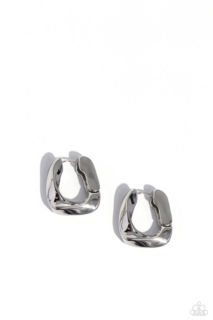 Featuring a beveled, asymmetric surface, a thick silver hoop snugly curls around the ear for a sleek basic look. Earring attaches to a standard hinge closure fitting. Hoop measures approximately 3/4" in diameter.
