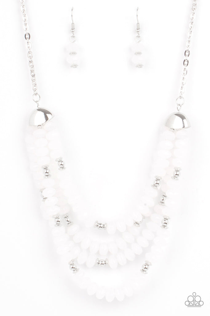 Featuring bold silver fittings, a whimsical collection of faceted white opaque crystal-like beads and dainty silver beads are threaded along invisible wires below the collar, creating icy layers. Features an adjustable clasp closure.