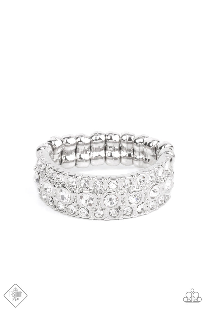 A silver band is encrusted with dazzling dainty white rhinestones arranged in sumptuous layers. The centermost layer is embellished with larger rhinestones that visually lift off the finger for an eye-catching finish. Features a dainty stretchy band for a flexible fit.
