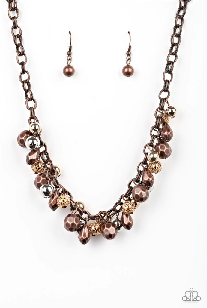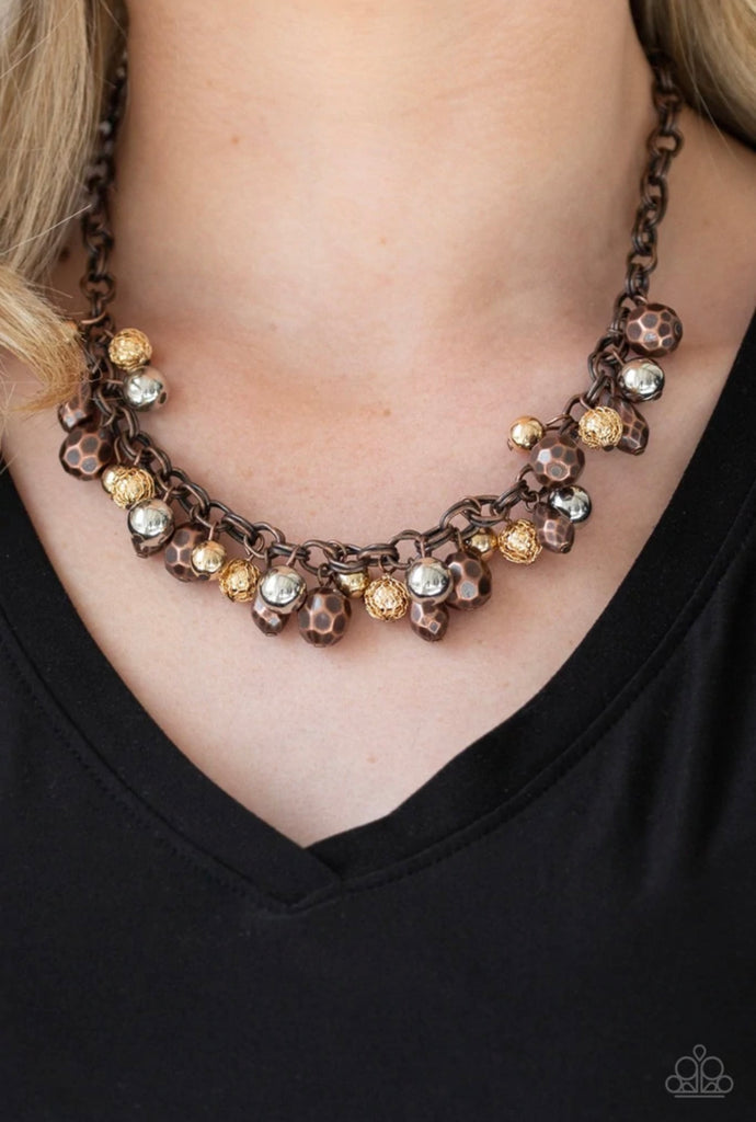 Featuring shiny, faceted, and mesh finishes, mismatched copper, gold, and silver beads trickle below the collar for an edgy industrial look. Features an adjustable clasp closure.