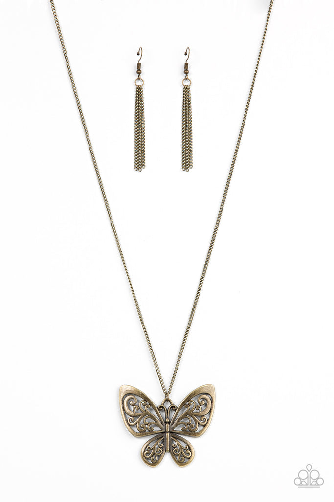 Filled with frilly filigree details, a rustic brass butterfly flutters from the bottom of an extended brass chain for a whimsical fashion. Features an adjustable clasp closure.