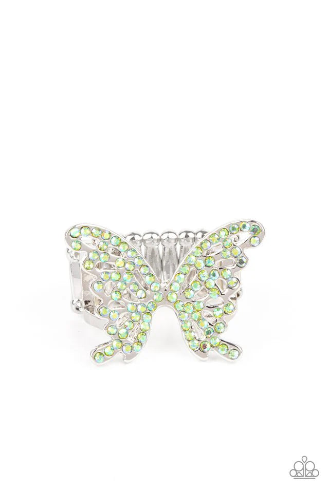 Enhance your style with the enchanting Paparazzi Ring ~ Butterfly Orchard in Green. Featuring dainty Green Ash rhinestones and a silver butterfly, this ring offers an iridescent shimmer for a magical touch. The stretchyband allows for a perfect fit, making it a must-have accessory.
