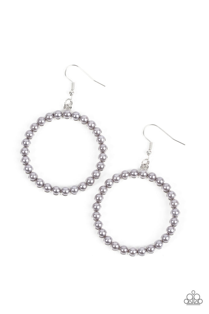 Bubbly silver pearls adorn the front of a textured silver hoop, invoking a timeless fashion. Earring attaches to a standard fishhook fitting.