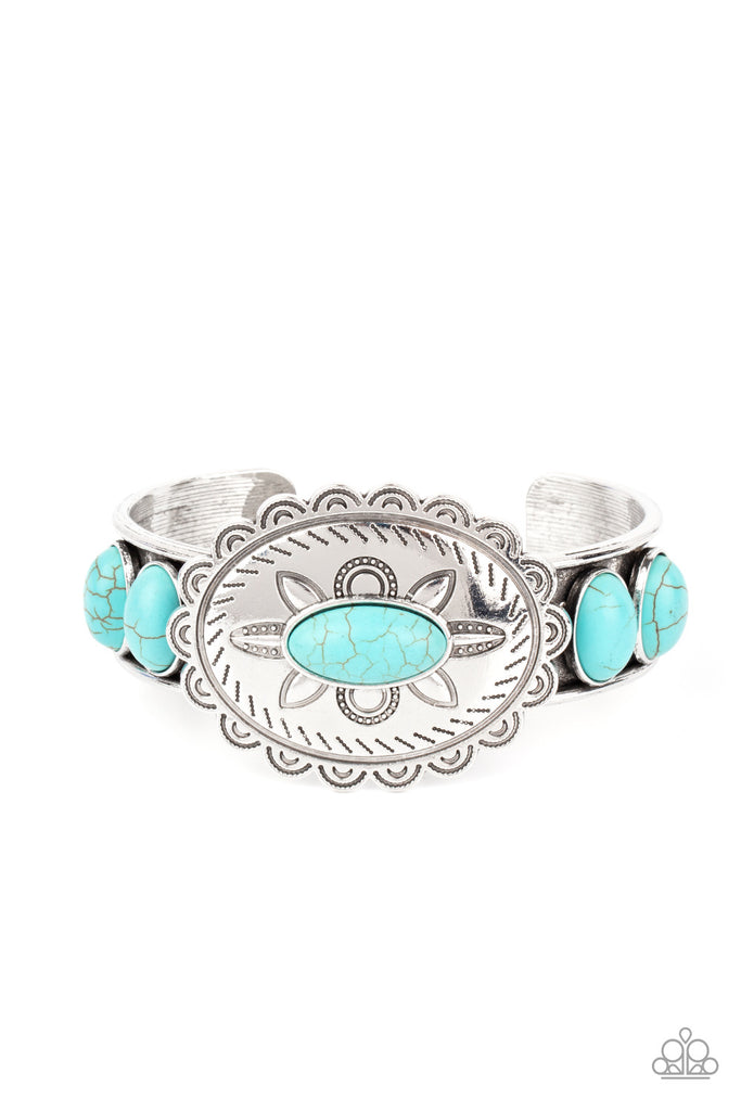 Dotted with a refreshing turquoise stone, a floral stamped scalloped silver frame sits atop a turquoise studded silver cuff, creating a southwestern inspired buckle atop the wrist.