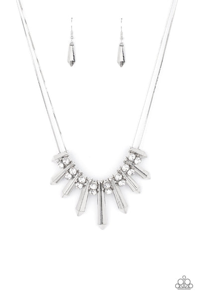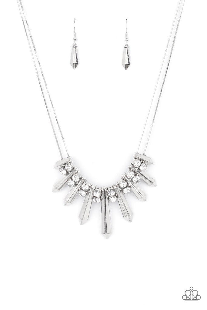 Pairs of glittery white rhinestones alternate between flared silver rods that are threaded along two rows of flat silver chains, creating a dangerous fringe below the collar. Features an adjustable clasp closure.