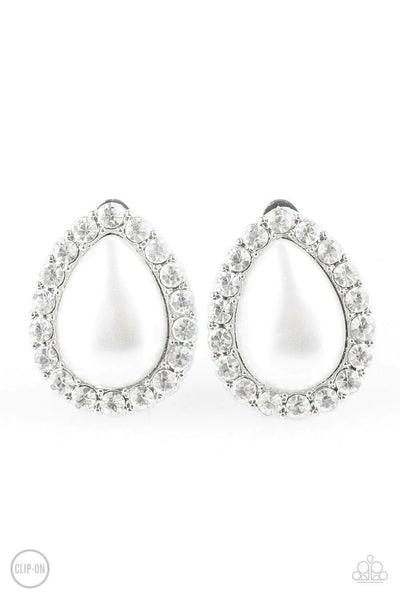 Glassy white rhinestones spin around a pearly teardrop center, creating a timeless frame. Earring attaches to a standard clip-on fitting.