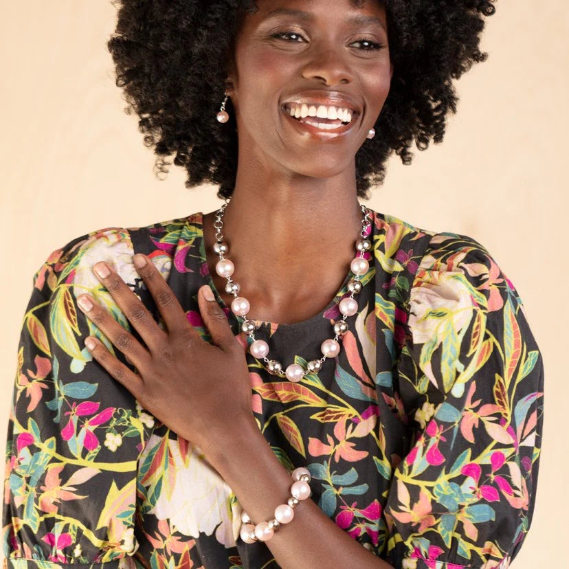 Dipped in an iridescent finish, oversized Gossamer Pink pearls alternate with shiny silver beads along stretchy bands around the wrist for a dreamy pop of shimmer.