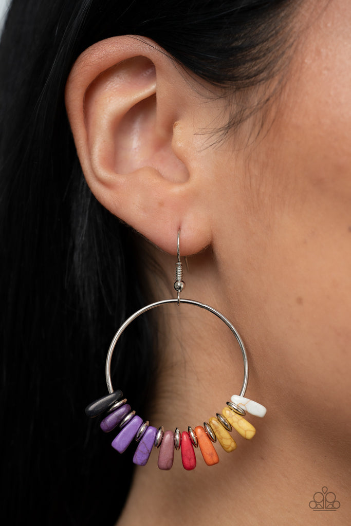 A rainbow of multicolored stones are separated by dainty silver discs along a silver hoop, resulting in a colorful and earthy fringe. Earring attaches to a standard fishhook fitting.