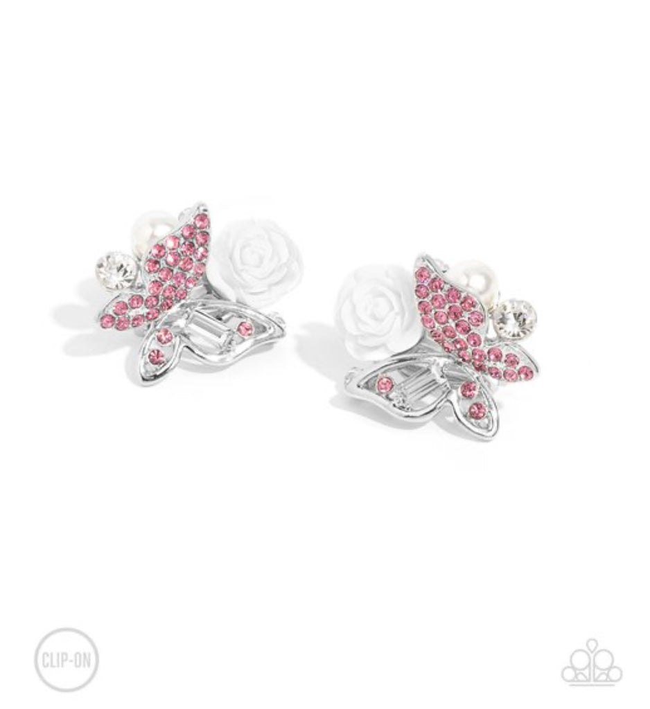 A pair of silver butterfly wings are adorned with pink rhinestones and accented with round and emerald-cut white rhinestones. A white resin rose and a shimmery pearl add an elegant touch to the whimsical design. Earring attaches to a standard clip-on fitting.