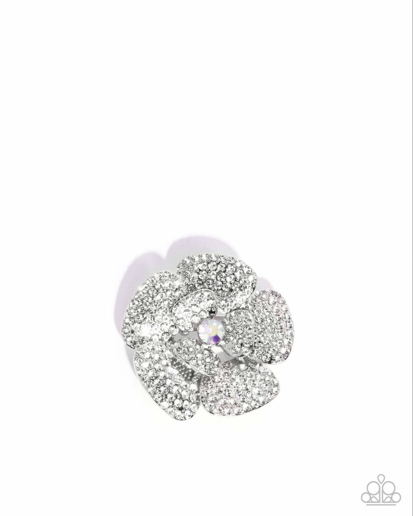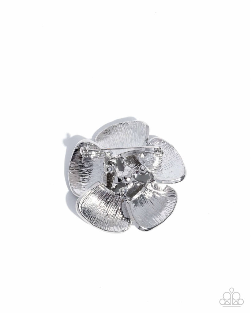 Featuring an iridescent rhinestone centerpiece, a dazzling three-dimensional white rhinestone-dotted silver flower blooms for a spellbinding display. Brooch measures approximately 1 3/4" in length and 1 3/4" in width. Due to its prismatic palette, color may vary.