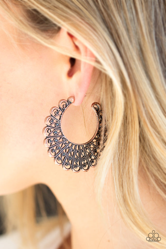Brushed in an antiqued shimmer, filigree filled petals curve into a whimsical hoop. Earring attaches to a standard post fitting. Hoop measures 2" in diameter.