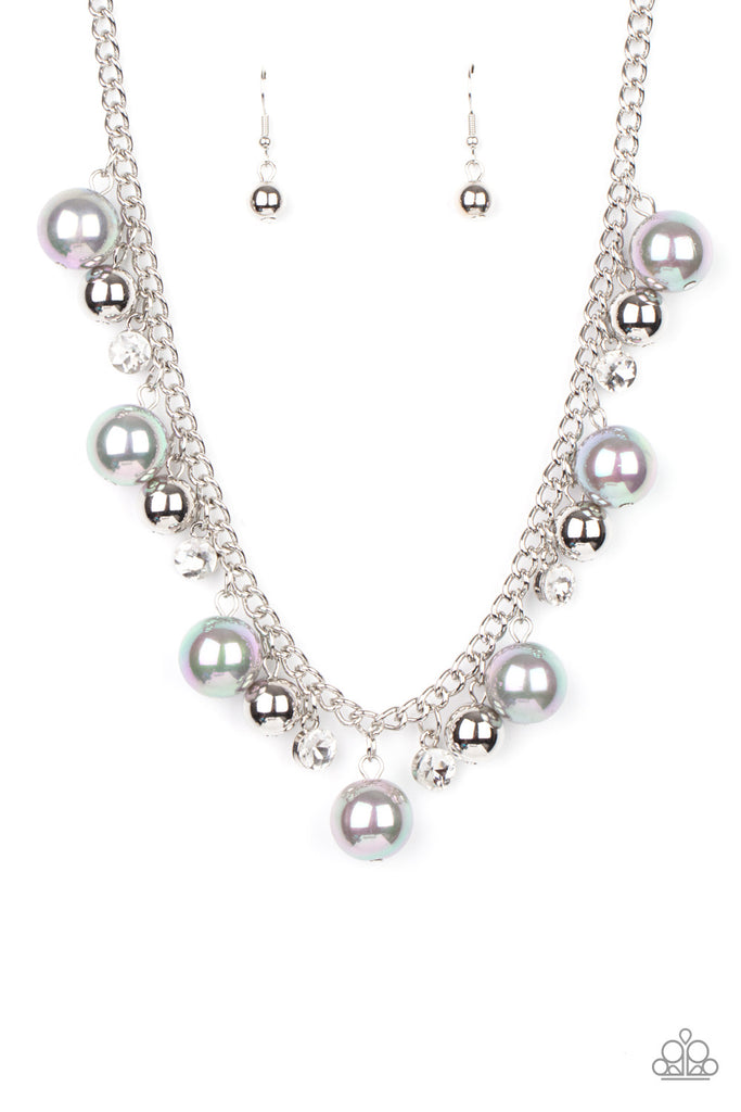 An oversized collection of shiny silver beads, white rhinestone accents, and silvery iridescent pearls dangle from a classic silver chain, creating a stellar fringe below the collar. Features an adjustable clasp closure.