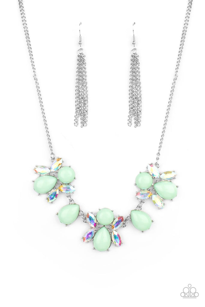 A bubbly collection of round and teardrop Green Ash beads coalesce with iridescent marquise cut rhinestones below the collar, creating a stellar centerpiece. Features an adjustable clasp closure.
