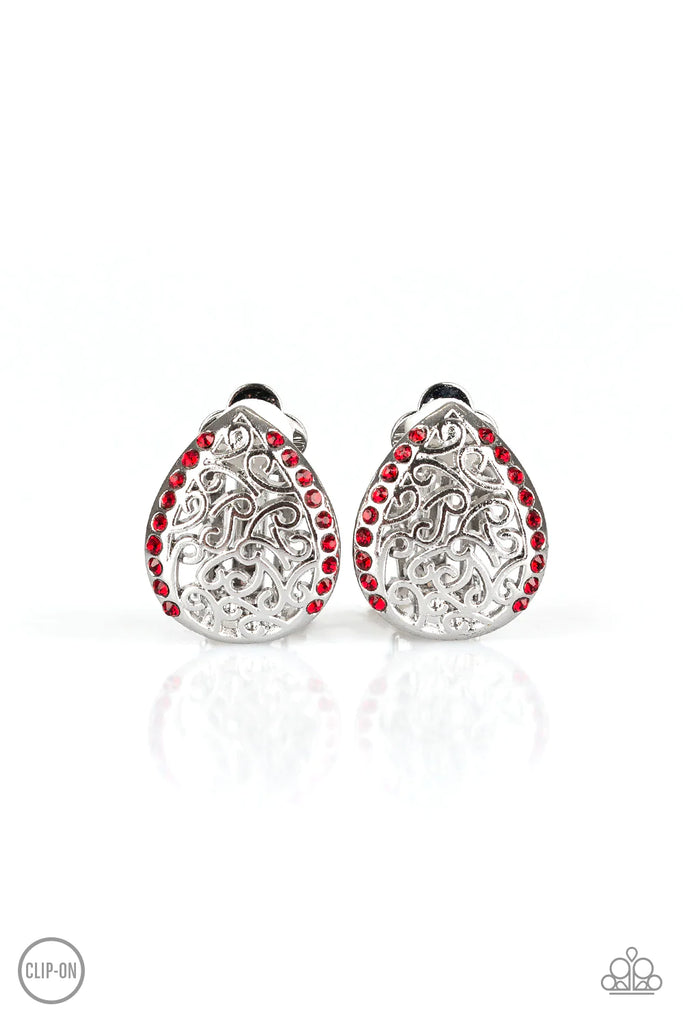 Trimmed in fiery red rhinestones, vine-like filigree climbs a dainty silver teardrop for a whimsical look. Earring attaches to a standard clip-on fitting.