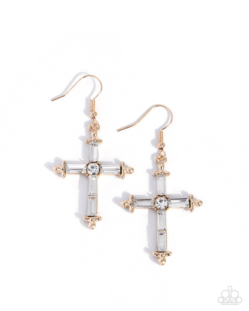 Pressed in elaborate gold fittings, emerald-cut white gems stack atop one another from a white rhinestone center, coalescing into an incandescent cross, for a celestially chic display. Earring attaches to a standard fishhook fitting.