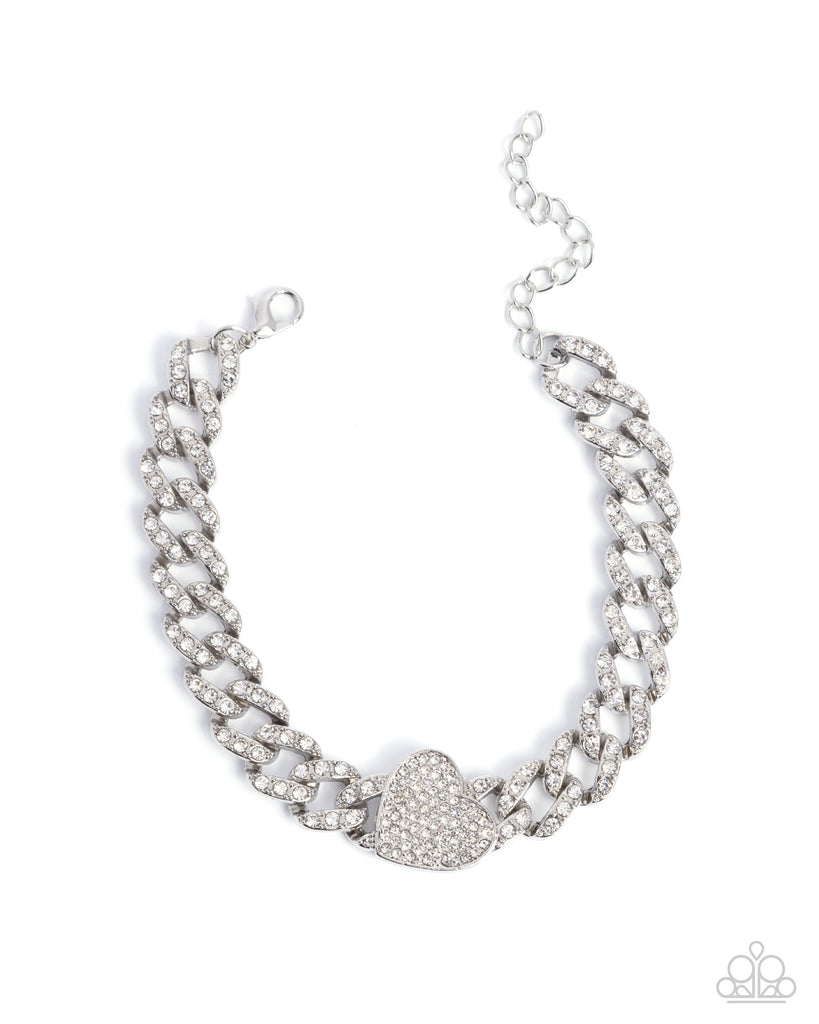 A chunky silver chain is embellished with glittering white rhinestones along its interlocking links. At the center, a heart-shaped pendant encrusted with white rhinestones adds a bold contrast to the design. Features an adjustable clasp closure.