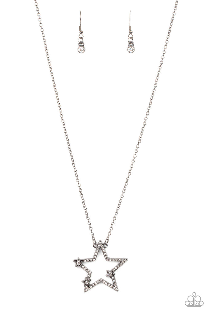 Dotted with glassy white rhinestone centers, a dainty trio of gunmetal stars haphazardly dots the front of a white rhinestone encrusted gunmetal star pendant for a stellar patriotic look. Features an adjustable clasp closure.