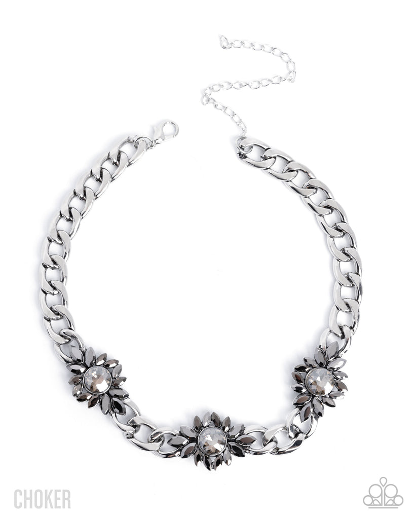 Framed by sunburst-like, hematite marquise-cut silver fittings, a collection of round smoky gems is sporadically placed along a silver curb chain for a standout statement. Features an adjustable clasp closure.