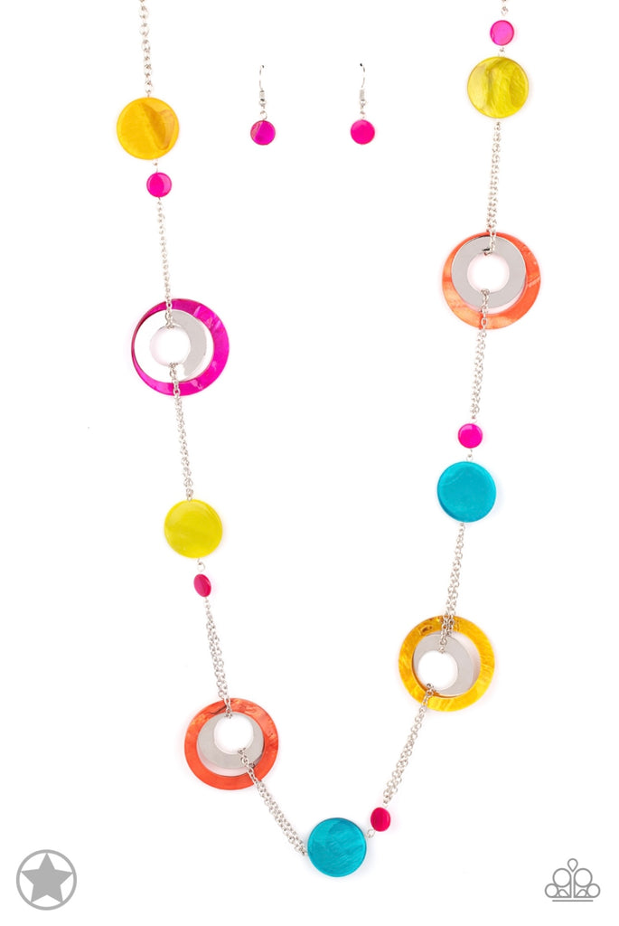 Chunky brightly-colored rings and discs with swirly marble finishes join thick metal hoops to climb a simple silver chain and create a retro-inspired feel. Features an adjustable clasp closure.