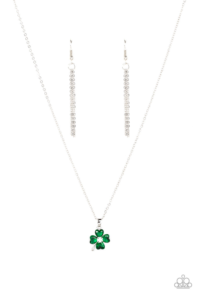 Sparkling with glittery green rhinestones, a silvery clover pendant glides along a dainty silver chain below the collar for a dazzling dash of St. Patrick's Day inspiration. Features an adjustable clasp closure.