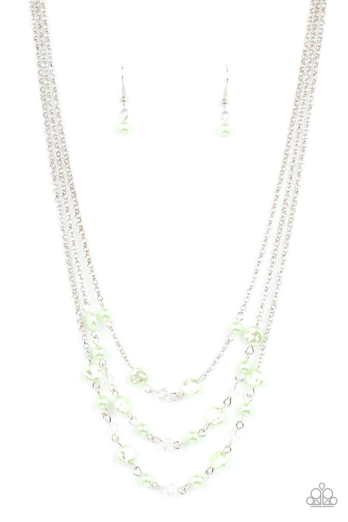 Dainty Green Ash pearls, glassy crystal-like beads, and imperfect Green Ash pearly accents sporadically link with sections of shimmery silver chains, creating timeless layers below the collar. Features an adjustable clasp closure.