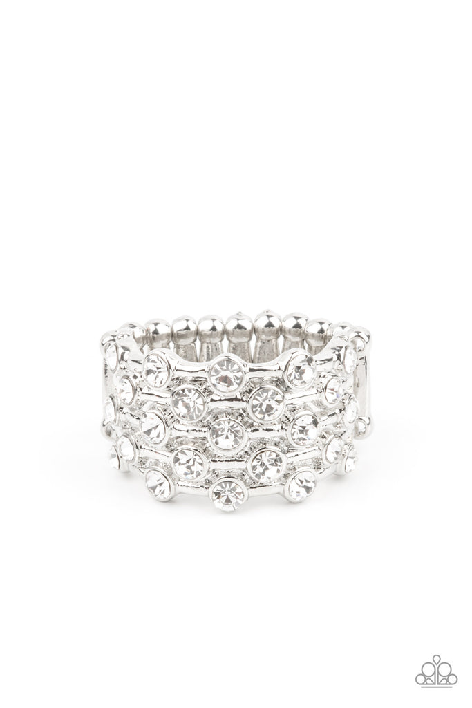 Sparkling white rhinestones encased in silver frames line up in layers across shiny silver bands creating a shimmering statement atop the finger. Features a stretchy band for a flexible fit.