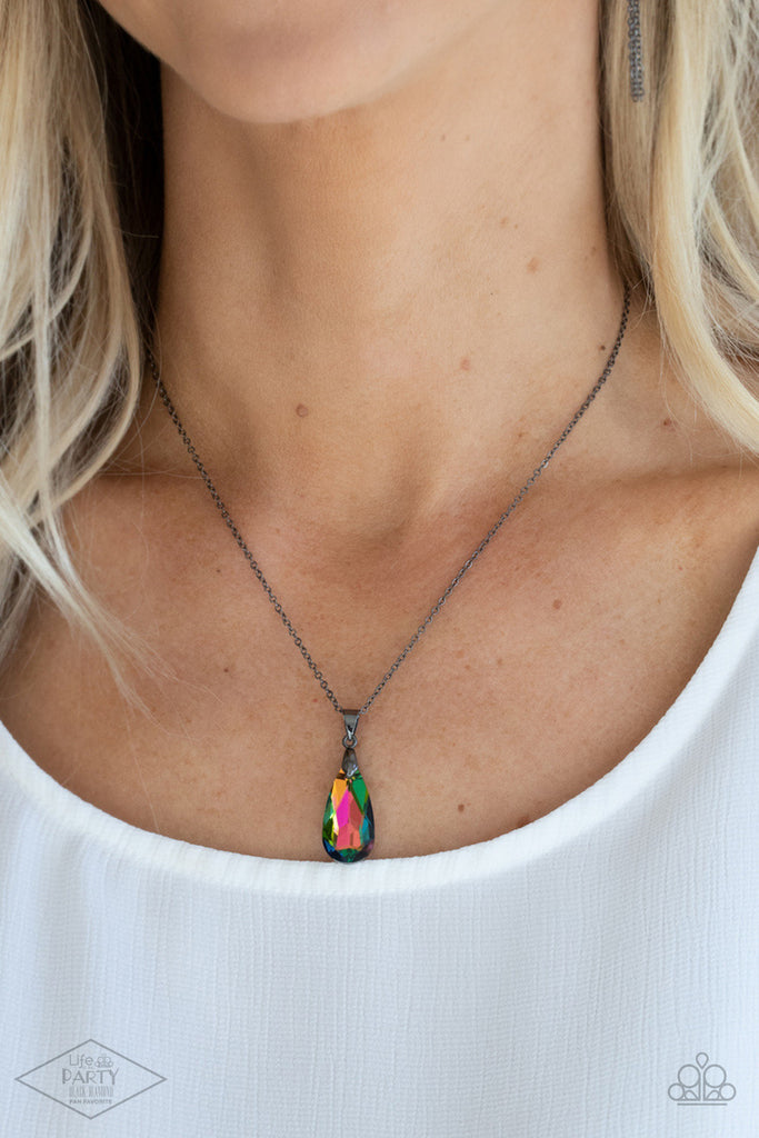 A glittery oil spill teardrop gem swings from the bottom of a glistening gunmetal chain, creating a stellar pendant below the collar. Features an adjustable clasp closure.