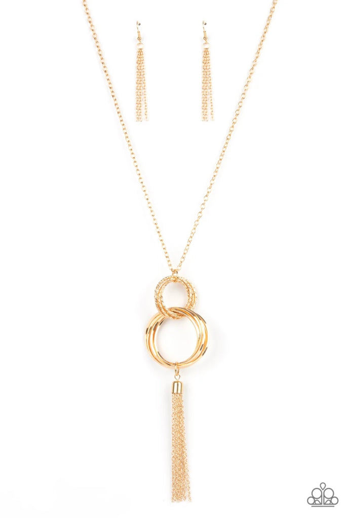 A collection of shimmery cross-cut gold hoops and larger smooth hoops link together in a striking out-of-this-world display. A gold tassel sways from the bottom of the lengthened necklace for an extra show of splendor. Features an adjustable clasp closure.