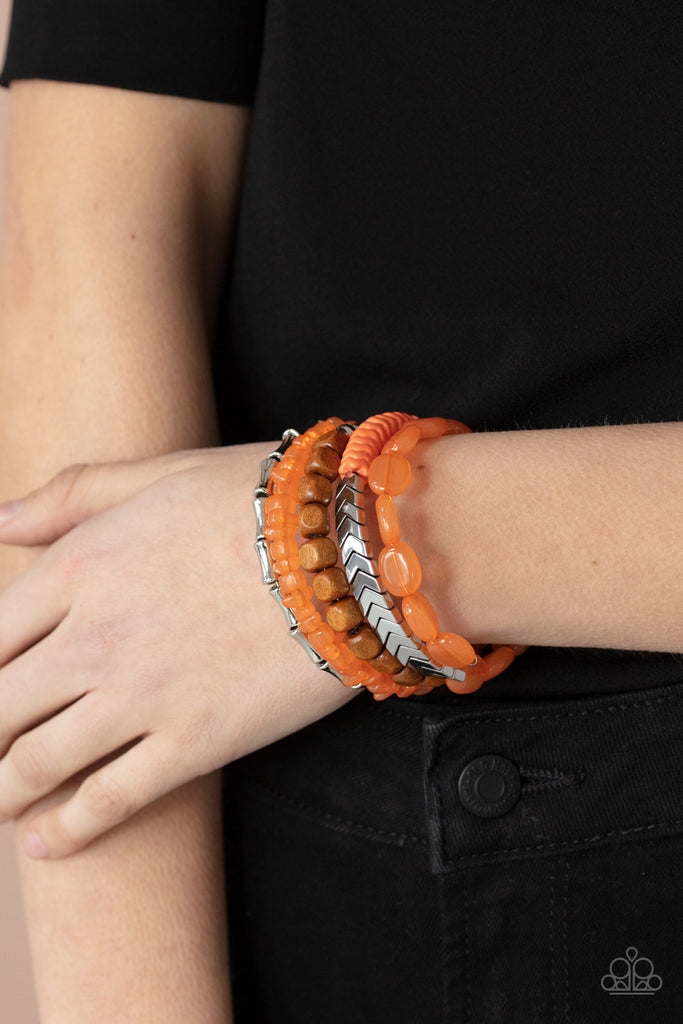 An earthy collection of wooden cubes, glassy orange acrylic ovals, wavy orange accents, tranquil orange pebble-like accents, classic silver beads and silver chevron frames are threaded along a long wire to create a whimsical infinity wrap bracelet around the wrist.