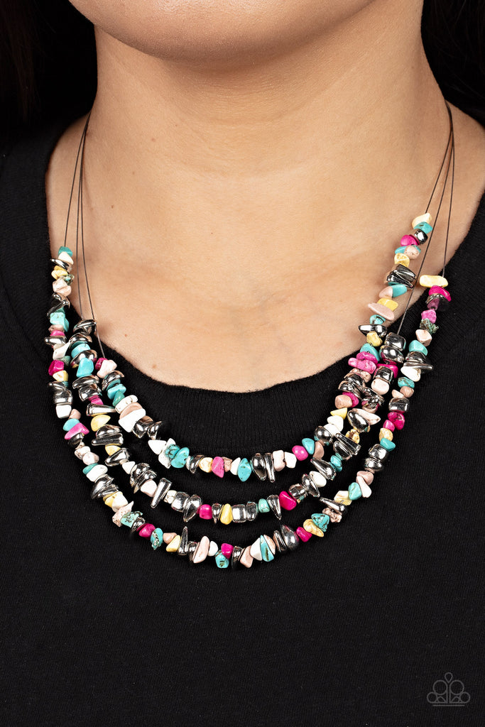 An earthy collection of raw cut silver and multicolored pebbles are threaded along dainty wires below the collar, creating refreshing layers. Features an adjustable clasp closure.