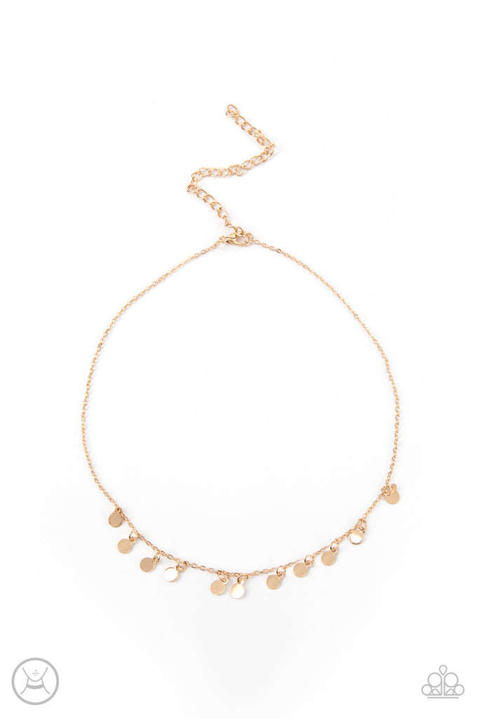 Dainty gold discs swing from a glistening gold chain, creating a shimmery fringe around the neck. Features an adjustable clasp closure.