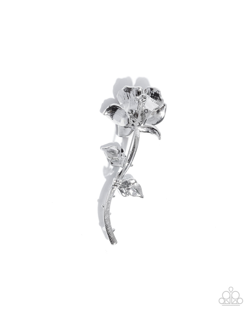 Featuring red and Malachite rhinestones, an intricately detailed silver rose complete with textured leaves, thorns, and three-dimensional petals blooms into a breathtaking centerpiece. Brooch measures approximately 1 1/4" in length and 3" in width.