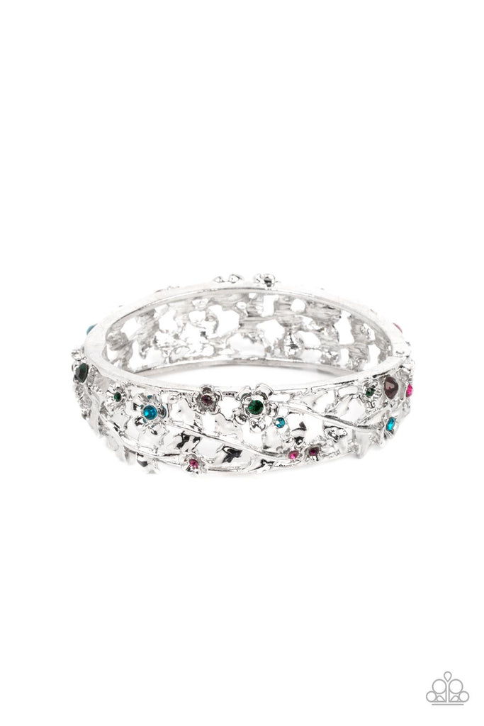 Dotted with dainty plum, Mykonos Blue, Leprechaun, and Fuchsia Fedora rhinestone centers, flowering leafy silver vines bloom into two oversized silver frames that delicately hinge into a versatile bangle-like bracelet. Features a hinged closure.