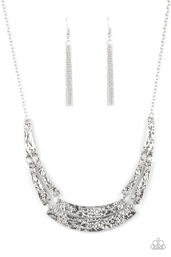 Featuring a high-sheen finish, abstract silver frames are embossed in gritty texture as they delicately link below the collar for a rustic display. Features an adjustable clasp closure.