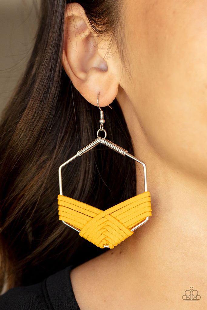 Strands of yellow suede decoratively weaves around the bottom of a hexagonal silver frame, creating a colorfully rustic centerpiece. Earring attaches to a standard fishhook fitting.