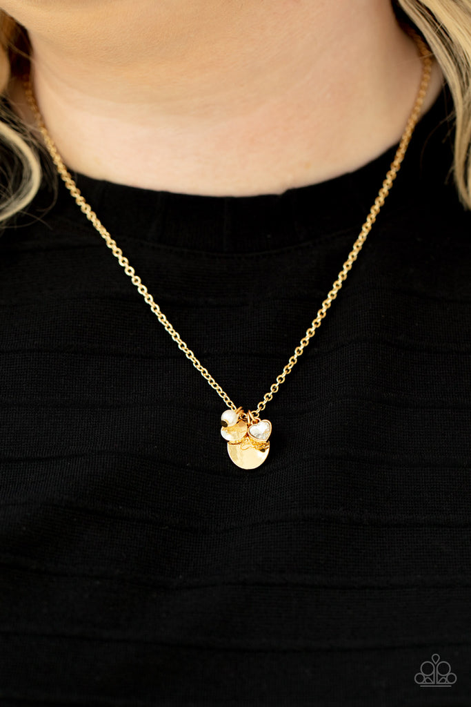 A whimsical charm collection including, a white pearl, glittery rhinestone heart, a dainty gold disc stamped in the word, "Mom," and a gold pendant stamped in the motivational phrase, "Do all things with love," delicately glide along a dainty gold chain below the collar for an endearing fashion. Features an adjustable clasp closure.