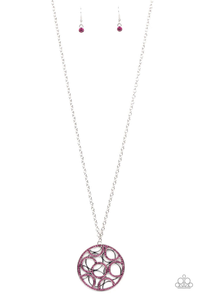 Overlapping silver rings and pink rhinestone encrusted circular frames coalesce into a glittery medallion at the bottom of a lengthened silver chain. Features an adjustable clasp closure.
