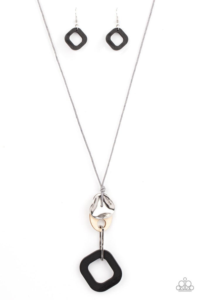 A hammered silver disc, brown wooden frame, hammered silver rectangular frame, and black wooden square frame link into an abstract pendant at the bottom of a gray cord. Features an adjustable clasp closure.