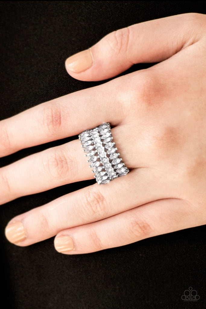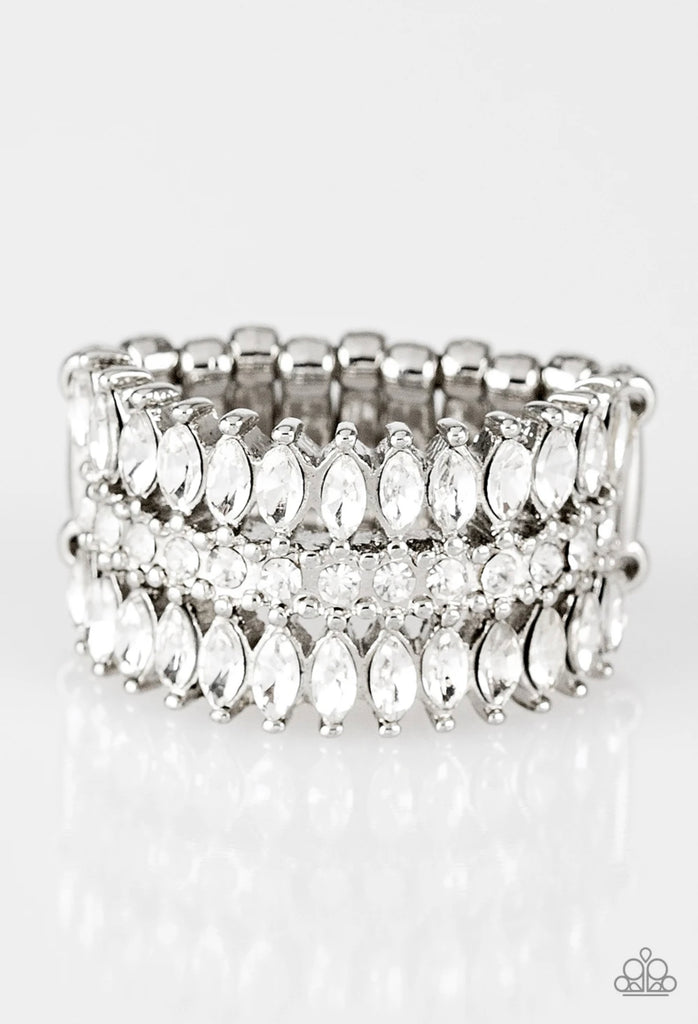Featuring refined marquise cuts, glittery white rhinestones flare from a center of glassy white rhinestones, creating a regal band across the finger. Features a stretchy band for a flexible fit.