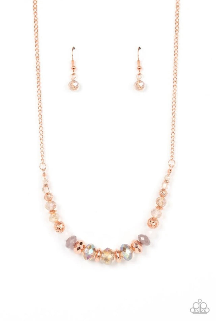 Varying in opacity, an enchanting collection of iridescent pink, white and champagne colored crystal-like beads are threaded along an invisible wire that is attached to a shiny copper chain below the collar. Mismatched shiny copper beads and ornate shiny copper accents are sprinkled between the glittery compilation, adding a whimsy sheen to the colorful statement piece. Features an adjustable clasp closure.