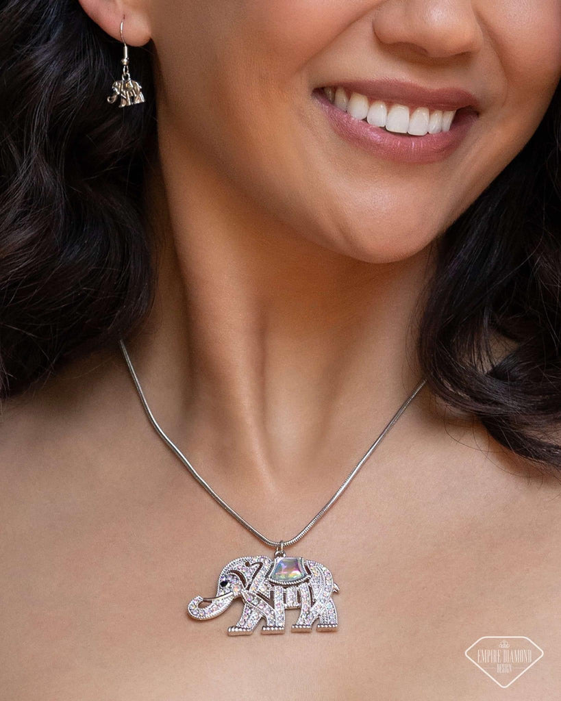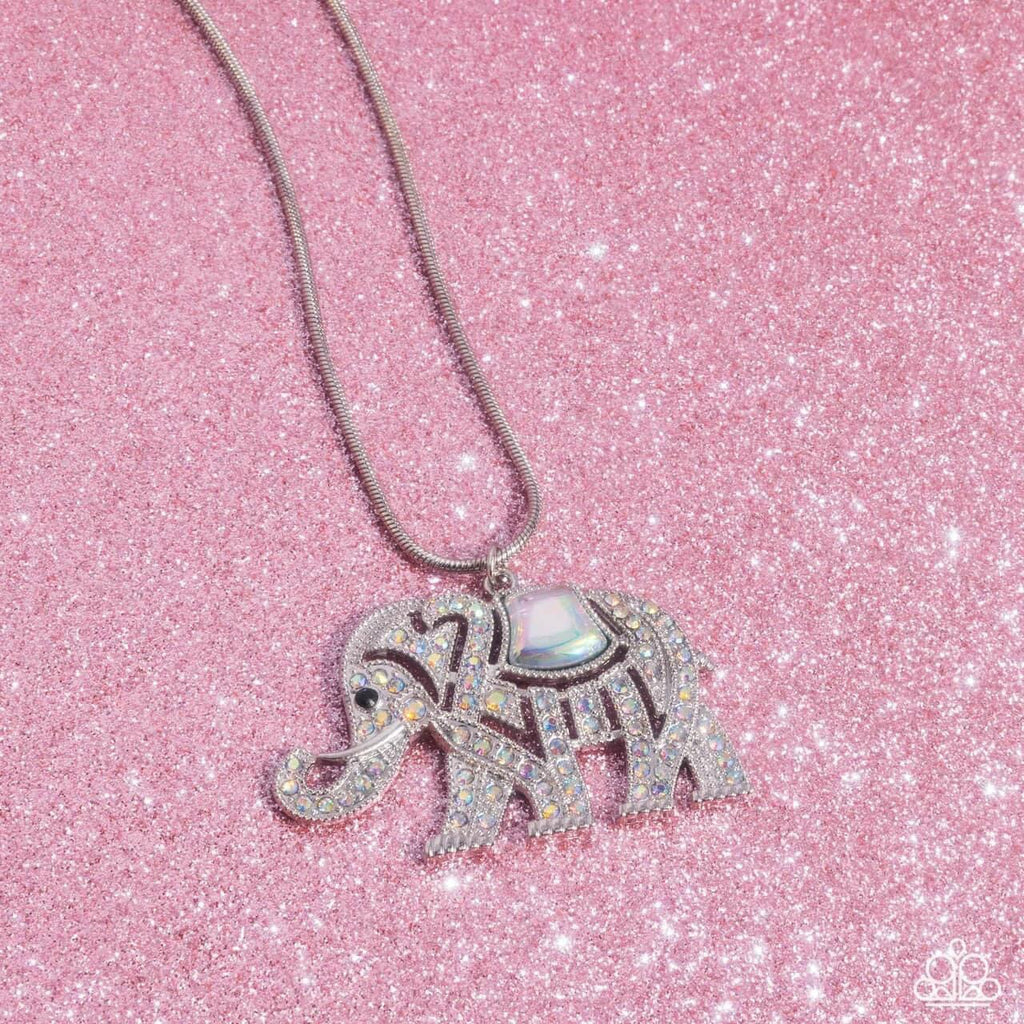 Featuring iridescent rhinestones, a textured silver elephant glides along a silver snake chain below the neck for a regally refined display. A resin opal saddle with a UV resin shimmers atop the elephant's back, further complementing the design's prismatic power. Features an adjustable clasp closure. Due to its prismatic palette, color may vary.